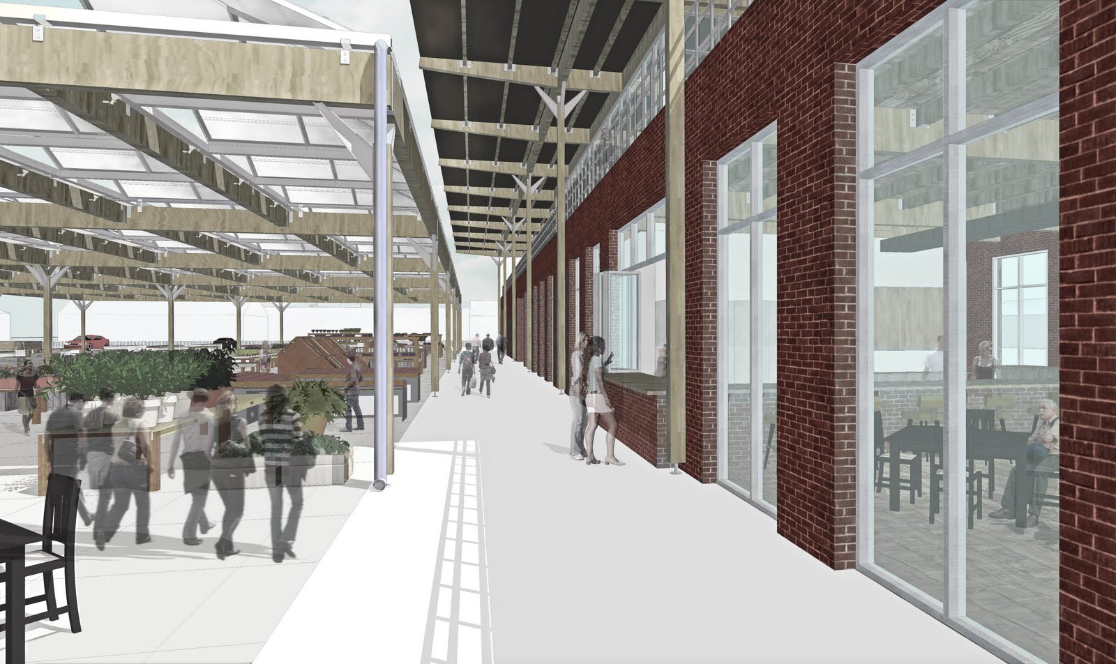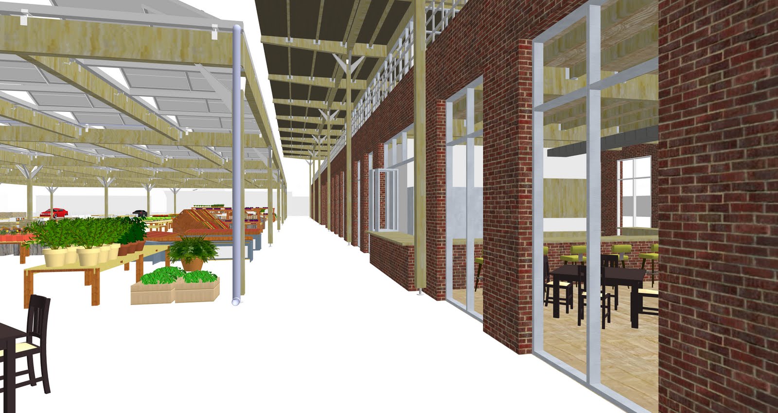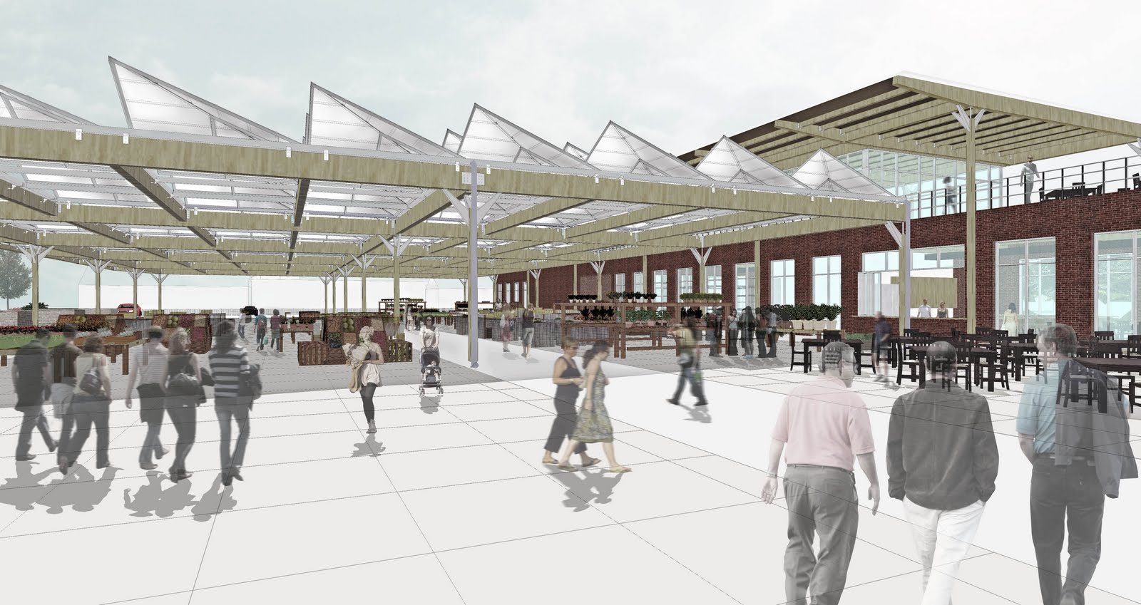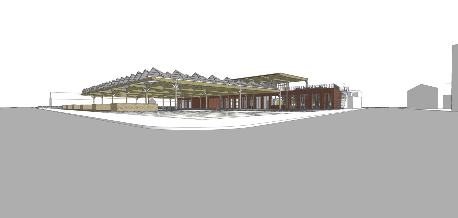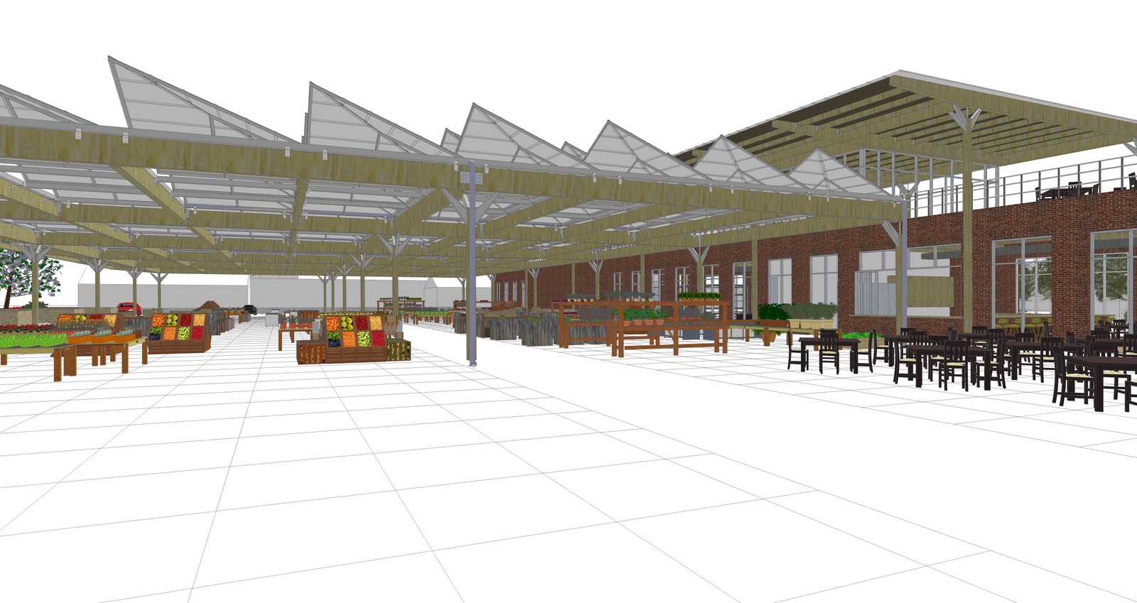 Site Concept: The site is within walking distance of residential neighborhoods and adjacent to common social gathering spaces near downtown Lafayette. It is served by a nearby structured parking garage for the majority of its parking, with an alleyway parking lot adjacent to the site providing more accessible spaces and parking for vendors and deliveries. The open-air market pavilion that covers the majority of the site is situated between a two-story service structure and the main road. The service building separates the plaza from adjacent residential uses, protecting the neighborhood without overwhelming it. An uncovered corner plaza faces two important downtown parks, and prominent bordering streets.