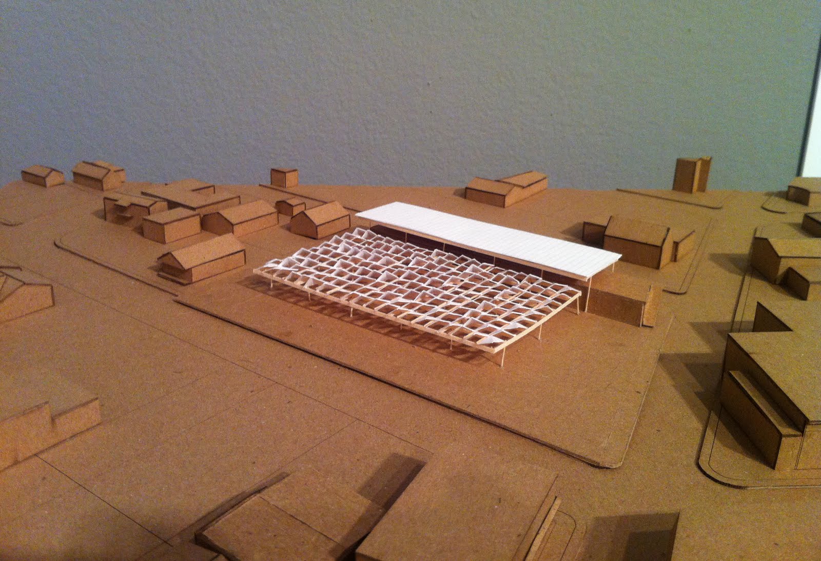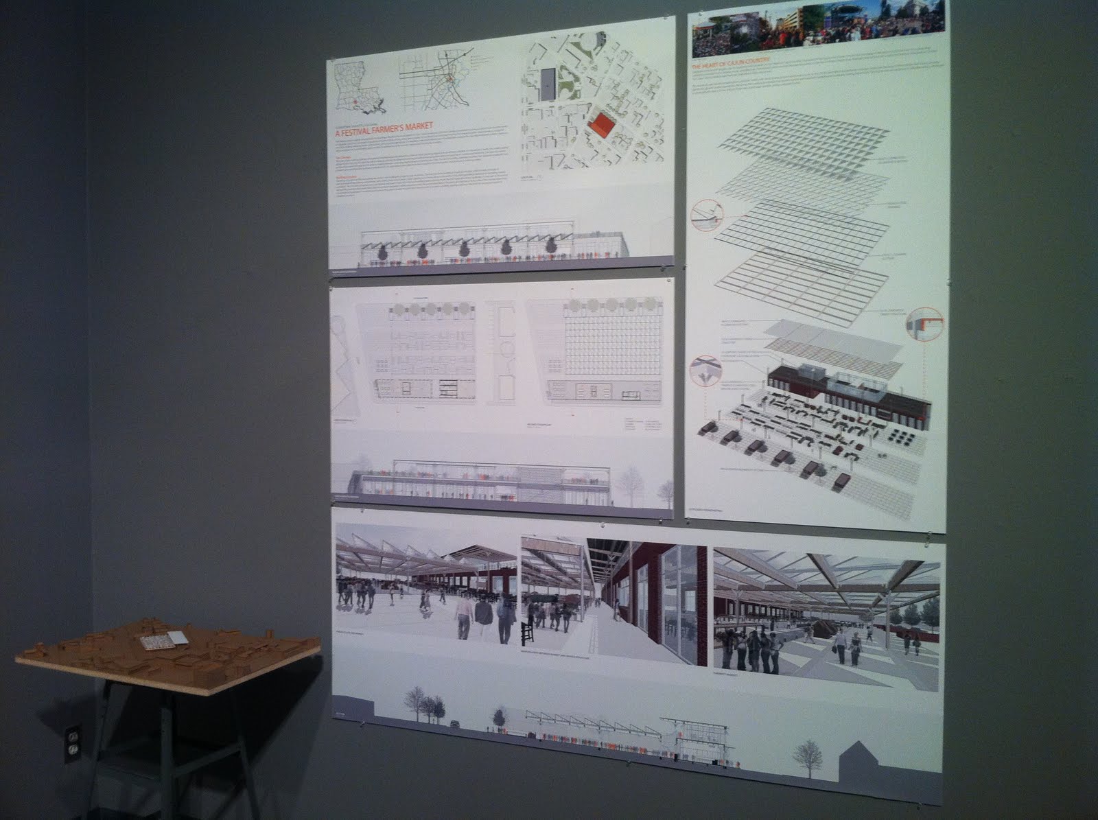 This design project explores the possibility of providing a flexible public space in a hot, humid urban area. Near the center of Lafayette, Louisiana, this social node will play host to festivals, concerts, Mardi Gras parades, and a farmer's market. The covered outdoor space serves as stage for civic life including reviewing stands, band venues, and a parade staging area. On weekdays, when local farmers are not selling their produce the naturally ventilated outdoor space can serve as a plaza that is protected against the daily thunderstorms of the summer season and cold drizzles of winter. Its program incorporates local food sales, dining, and cooking classes.